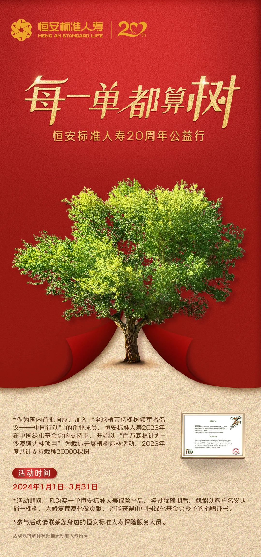 活動(dòng)期間,凡購買(mǎi)一單恒安標準人壽保險產(chǎn)品,經(jīng)過(guò)猶豫期后,就能以您的名義認捐一棵樹(shù),助力沙漠生態(tài)環(huán)境修復和生物多樣性平衡,還能獲得由中國綠化基金會(huì )授予的捐贈證書(shū)。